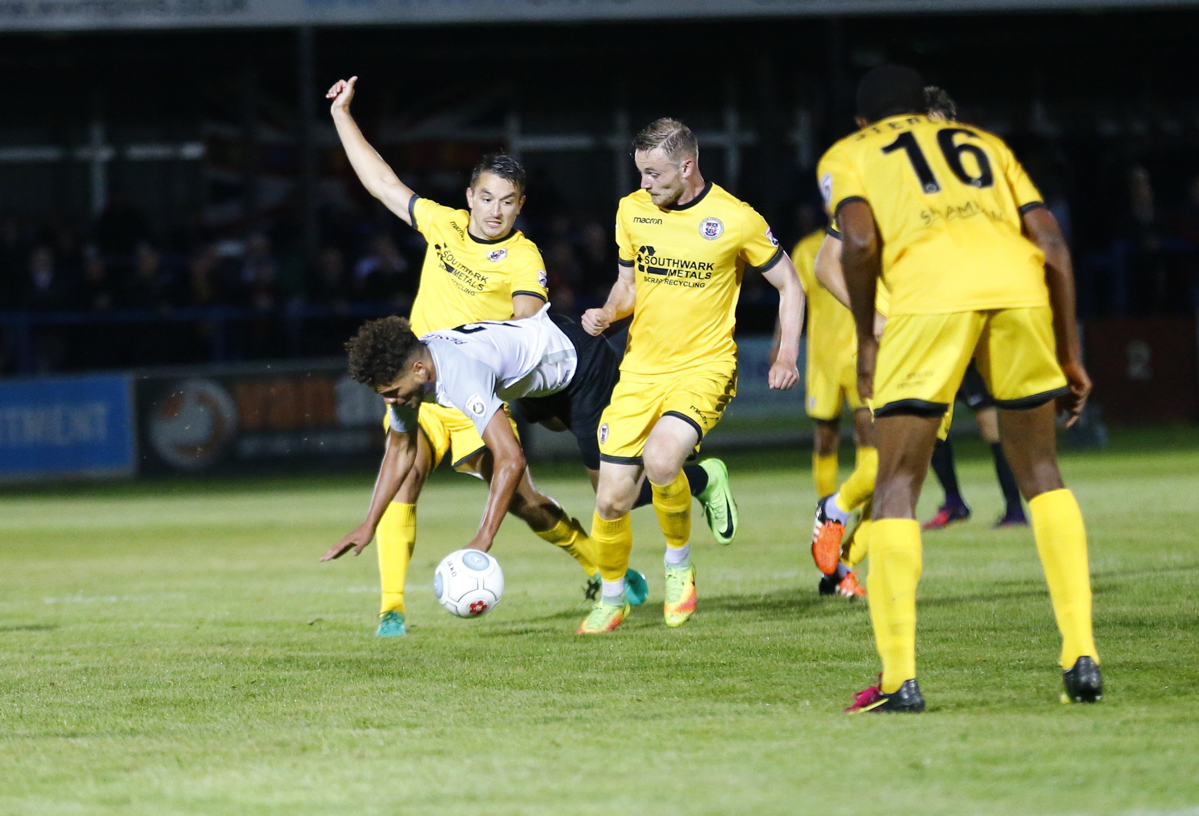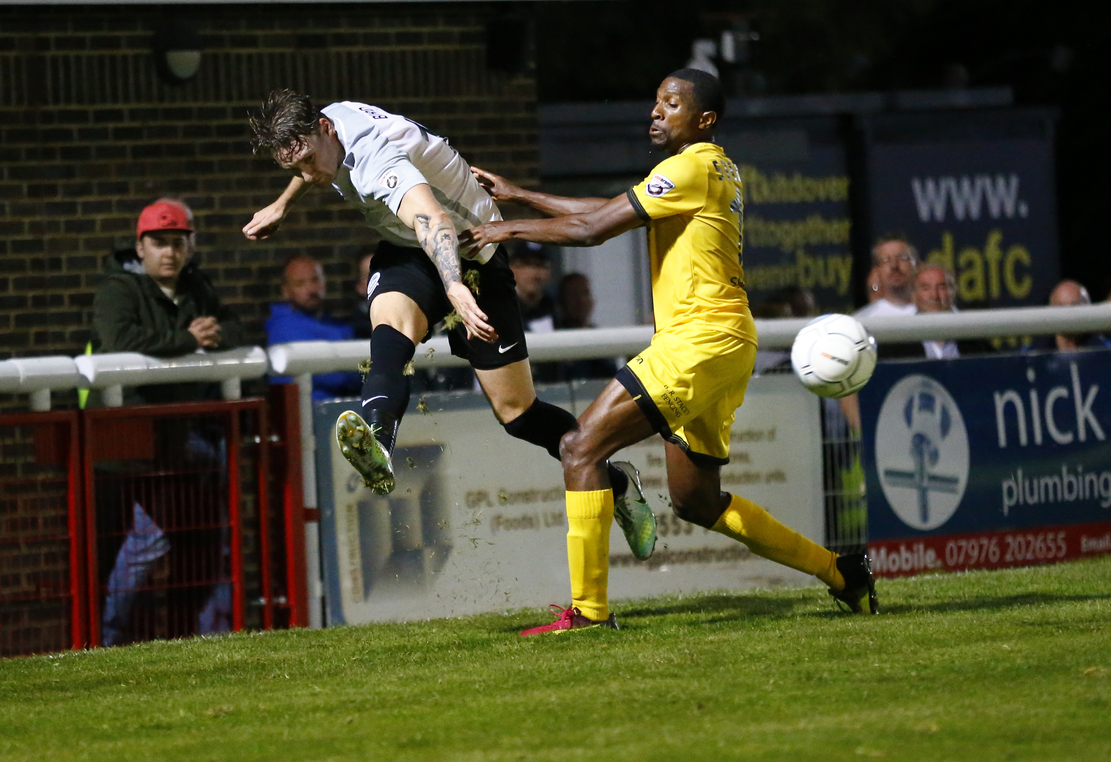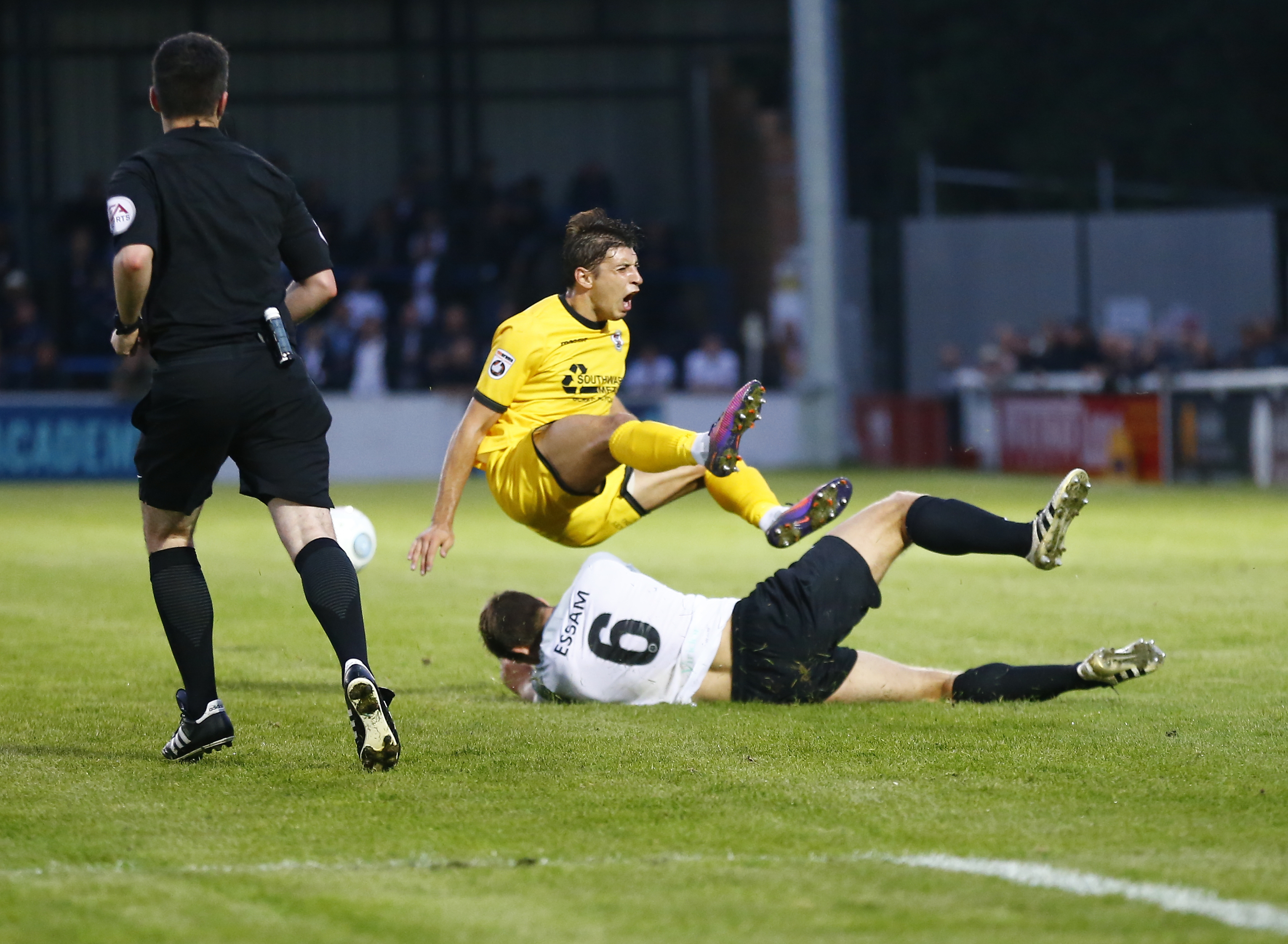 - Dover’s forward Ryan Bird falls over Wrexham’s midfielder Marcus Kelly.