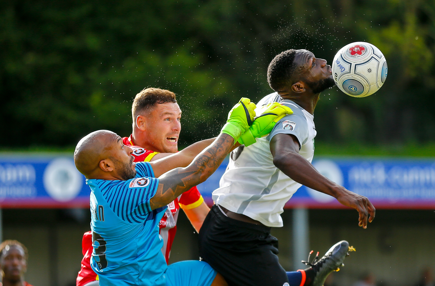 Third from top Dover Athletic against second from bottom Solihull Moors in Conference Premier at Crabble Stadium in Dover, England. Dover ran out winners by a goal to nothing. Dover’s defender Manny Parry puts Solihulls goal keeper Nathan Vaughan under pressure.