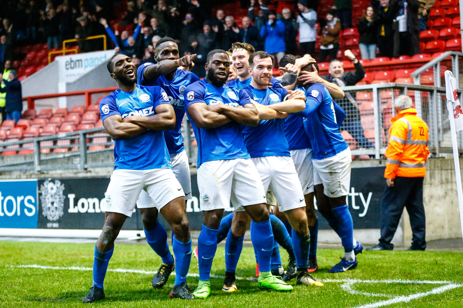 Dover’s midfielder Nortei Nortey celebrates scoring Dovers first goal late in the first half during the Vanorama National League match between Leyton Orient and Dover Athletic at the Matchroom Stadium, London, England on 18 November 2017