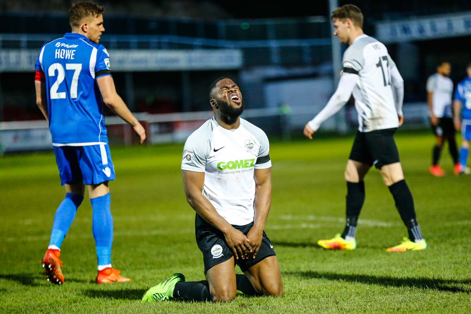 - Dover’s forward James Alabi cant believe how he missed a chance of another goal.
