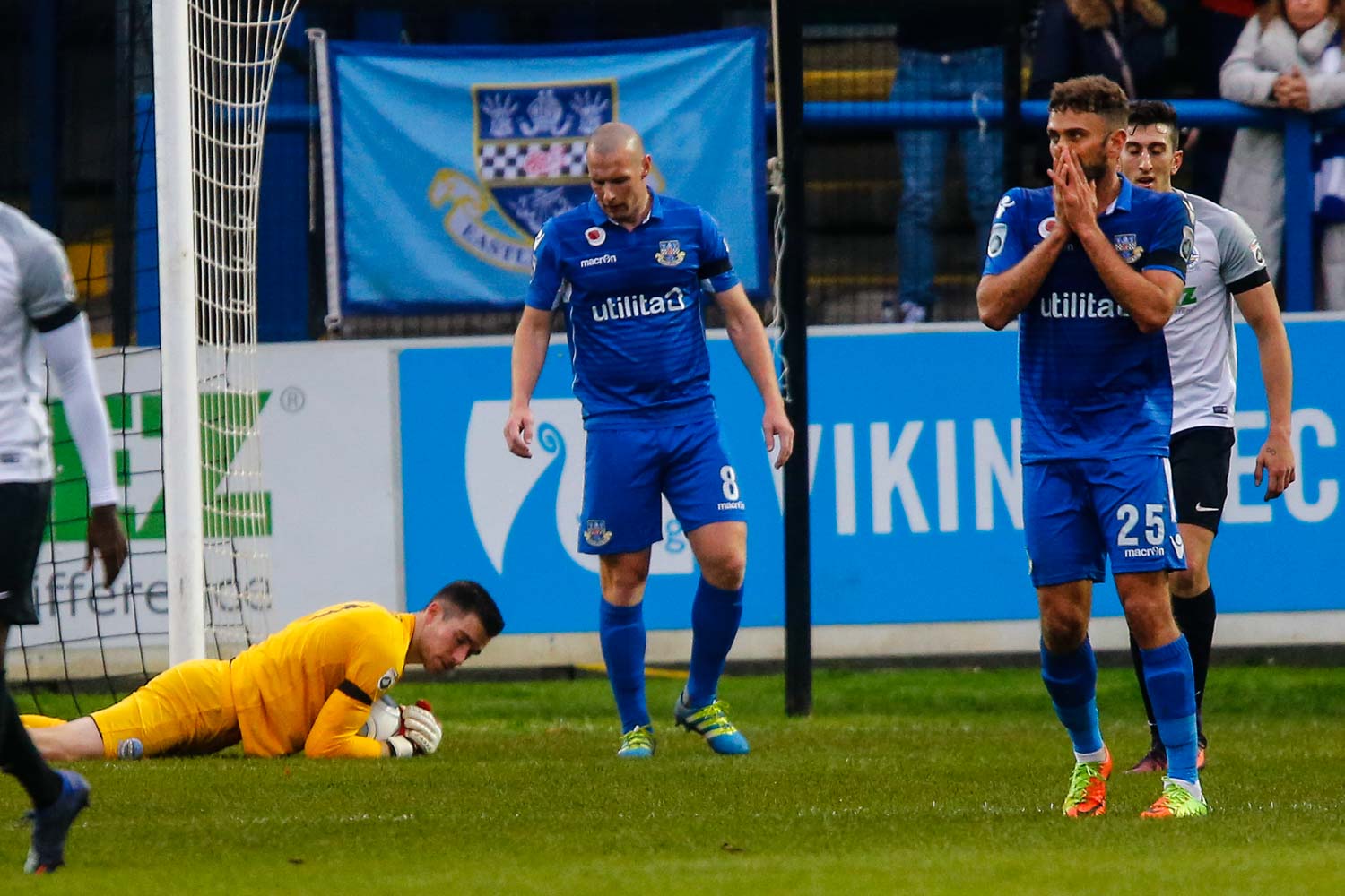 - Eastleigh players cant believe thier bad luck as Dover’s keeper Mitch Walker gathers the ball safely.