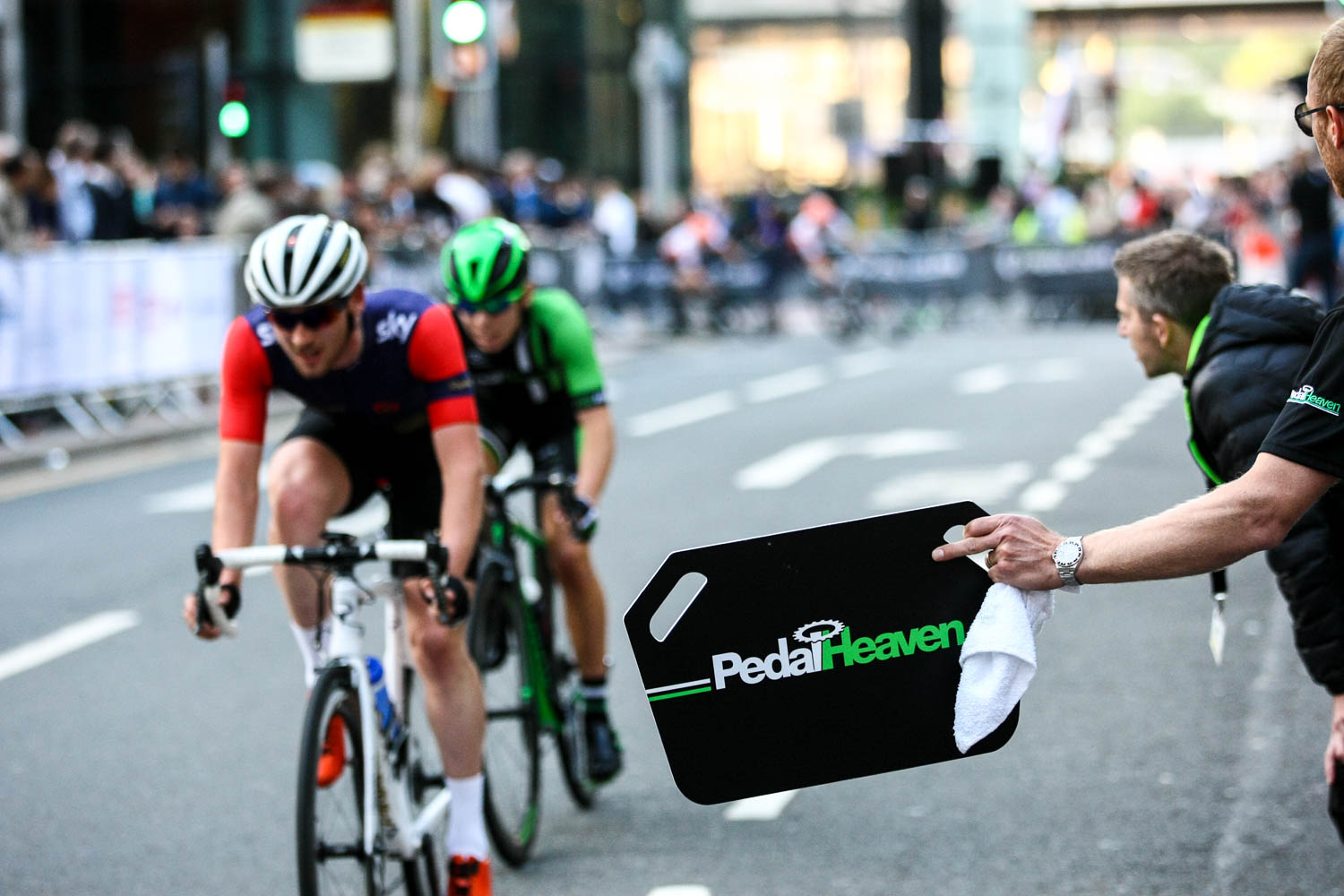 NFTO’s Australian Criterium Champion Steele Von Hoff and JLT Condor’s Ed Clancy giving a photo finish! Pearl Izumi Tour Series. Round 8 Canary Wharf 2015.
