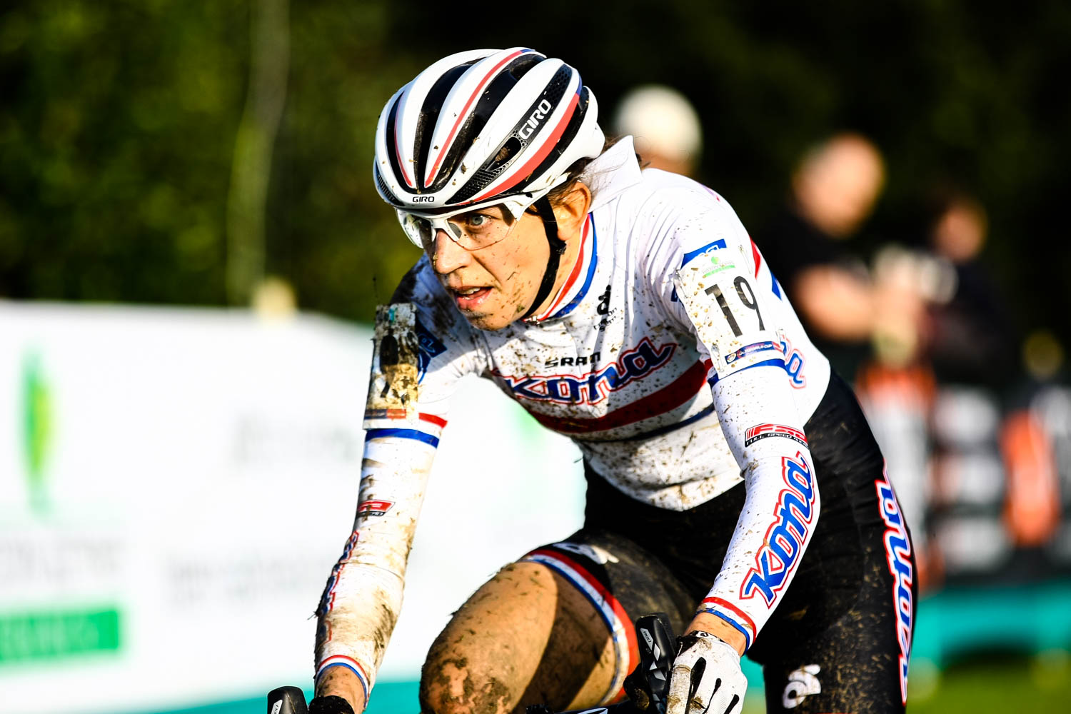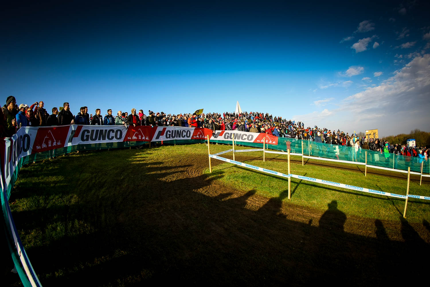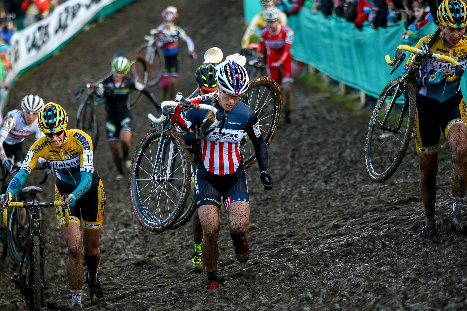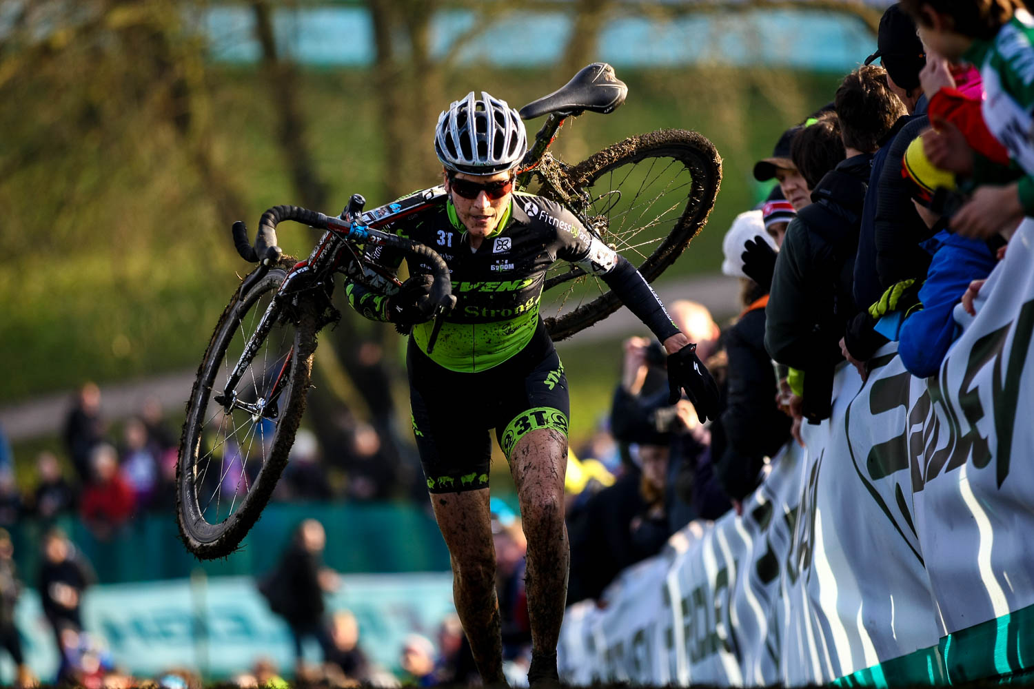 - Eventual winner Sanne Cant from Belgium tangles with the fence on the tricky decent. UCI Cyclo Cross World Cup, Campbell Park, Milton Keynes