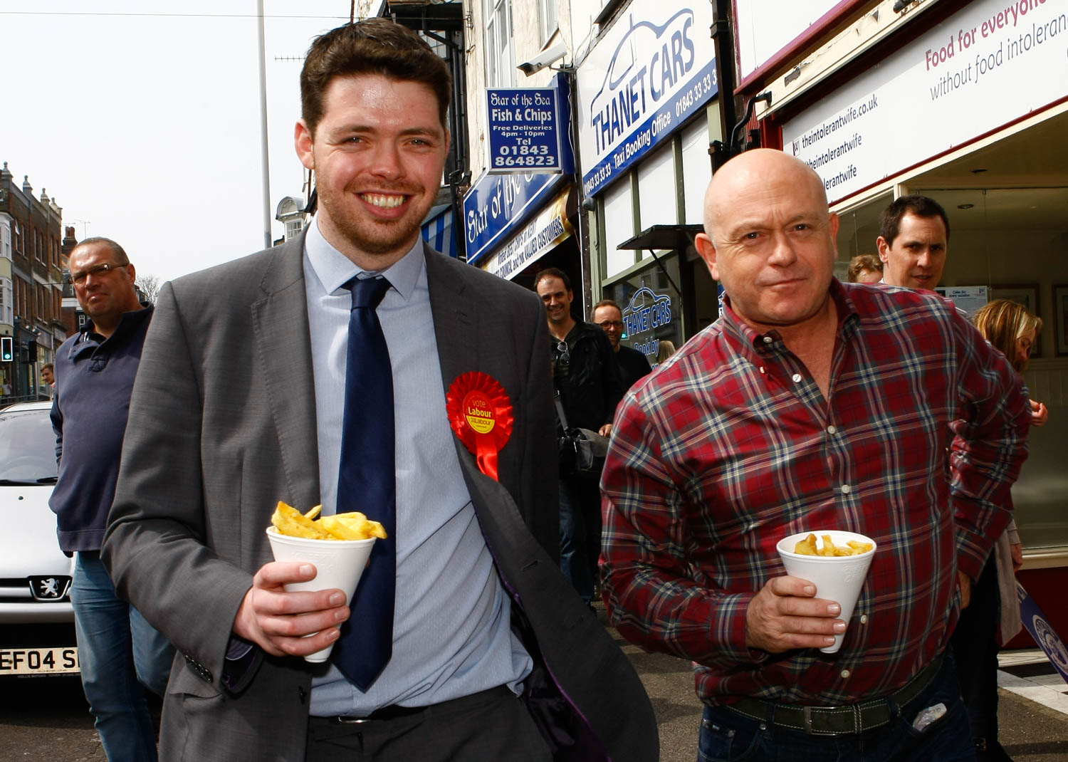 Will Scoobie and Ross Kemp stop and buy a lunch of a cone of chips. High St, Broadstairs, Kent CT10 1NQ. Ross Kemp celebrity Labour supporter accompanies Labour Candidate Will Scobie on a walk about in Broadstairs. Picture: Matt Bristow