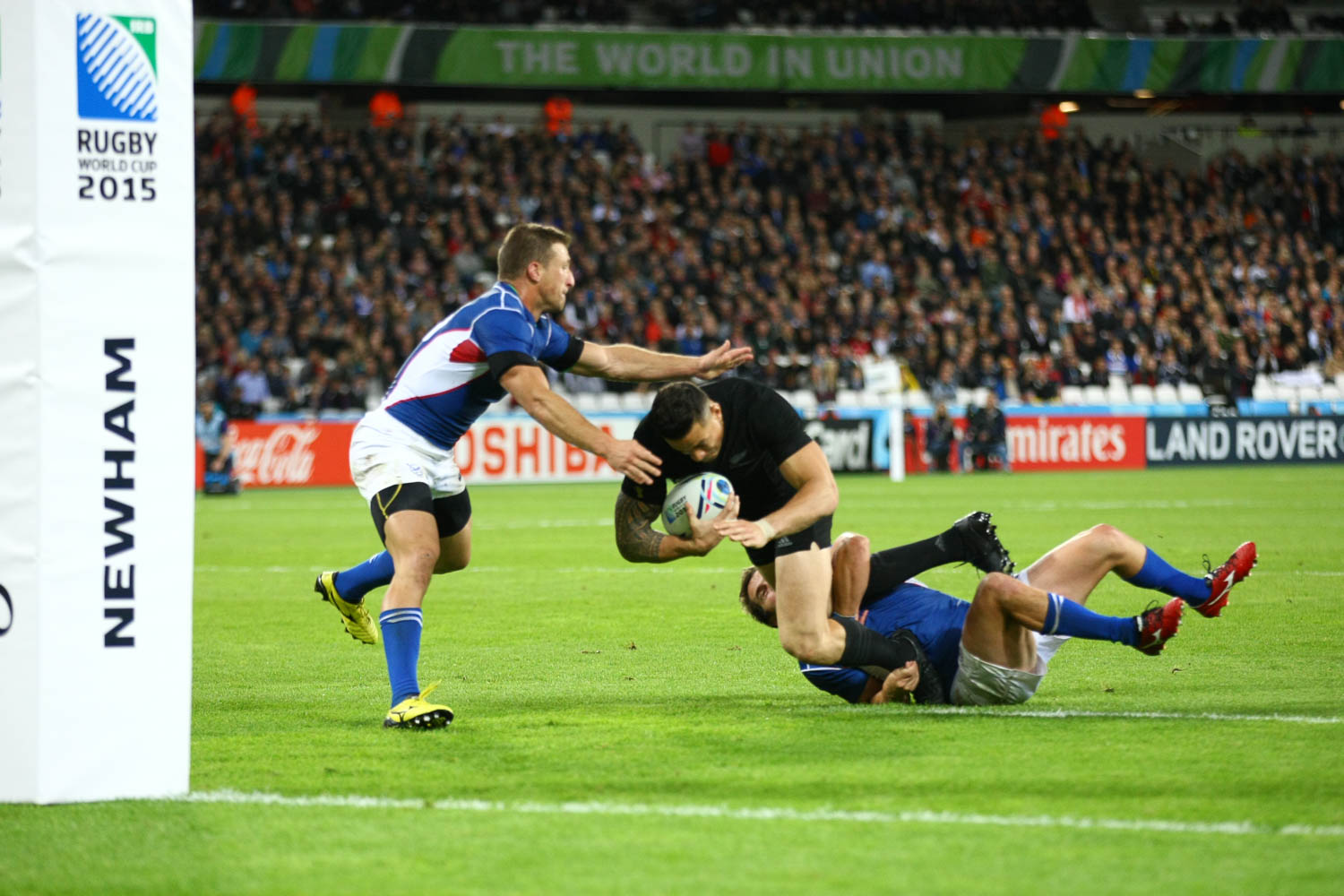 The Kiwis didn’t have it all their way as New Zealand’s Centre Sonny Bill Williams finds out. Rugby World Cup group game from Pool C between New Zealand and Namibia at Olympic Stadium. (c) Matt Bristow
