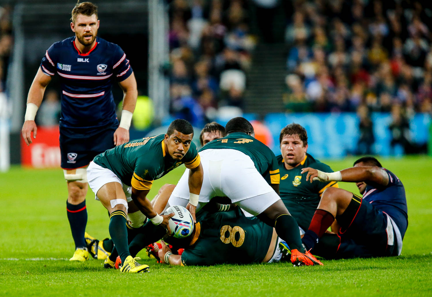 - South Africas Pat Lambie tries to escape a double tackle. Rugby World Cup group game from Pool B between South Africa and Japan. at Brighton Community Stadium. (c) Matt Bristow