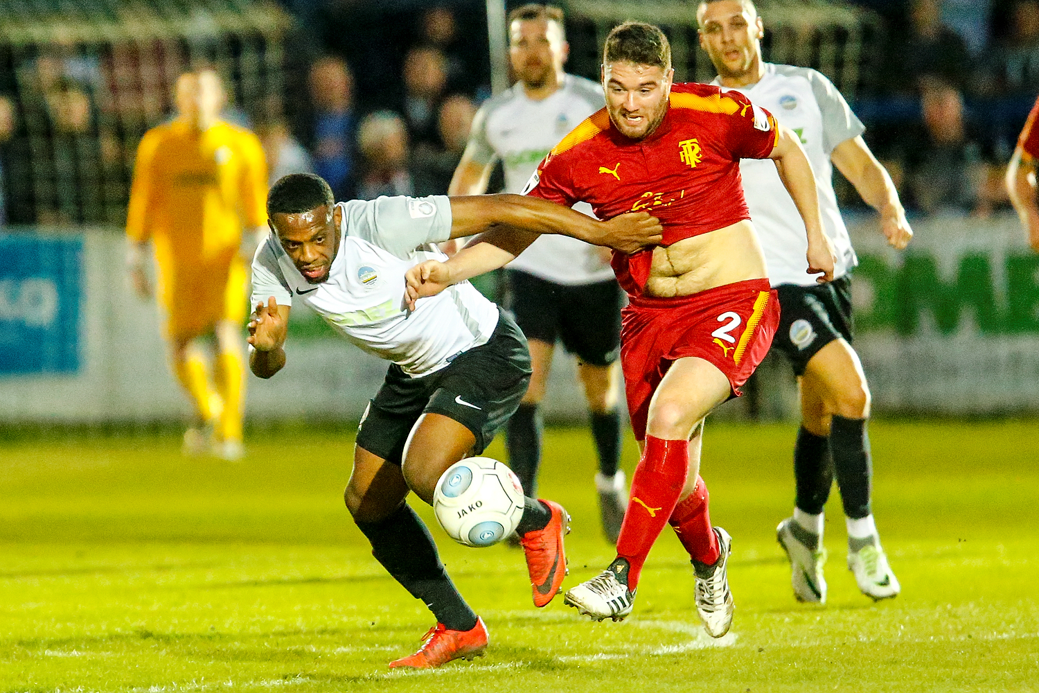 - Dover’s defender Giancarlo Gallifuoco surges forward while Tranmeres defender Adam Buxton rushes to clear the ball.