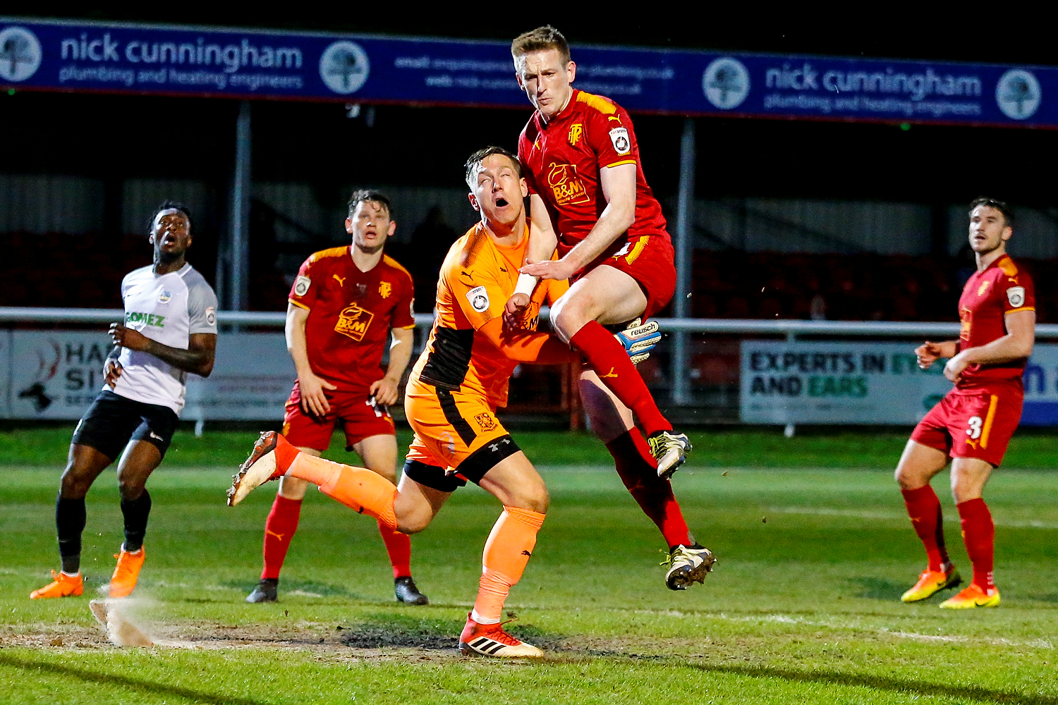 - Dover’s midfielder Mitch Brundle wins the ball in the air.