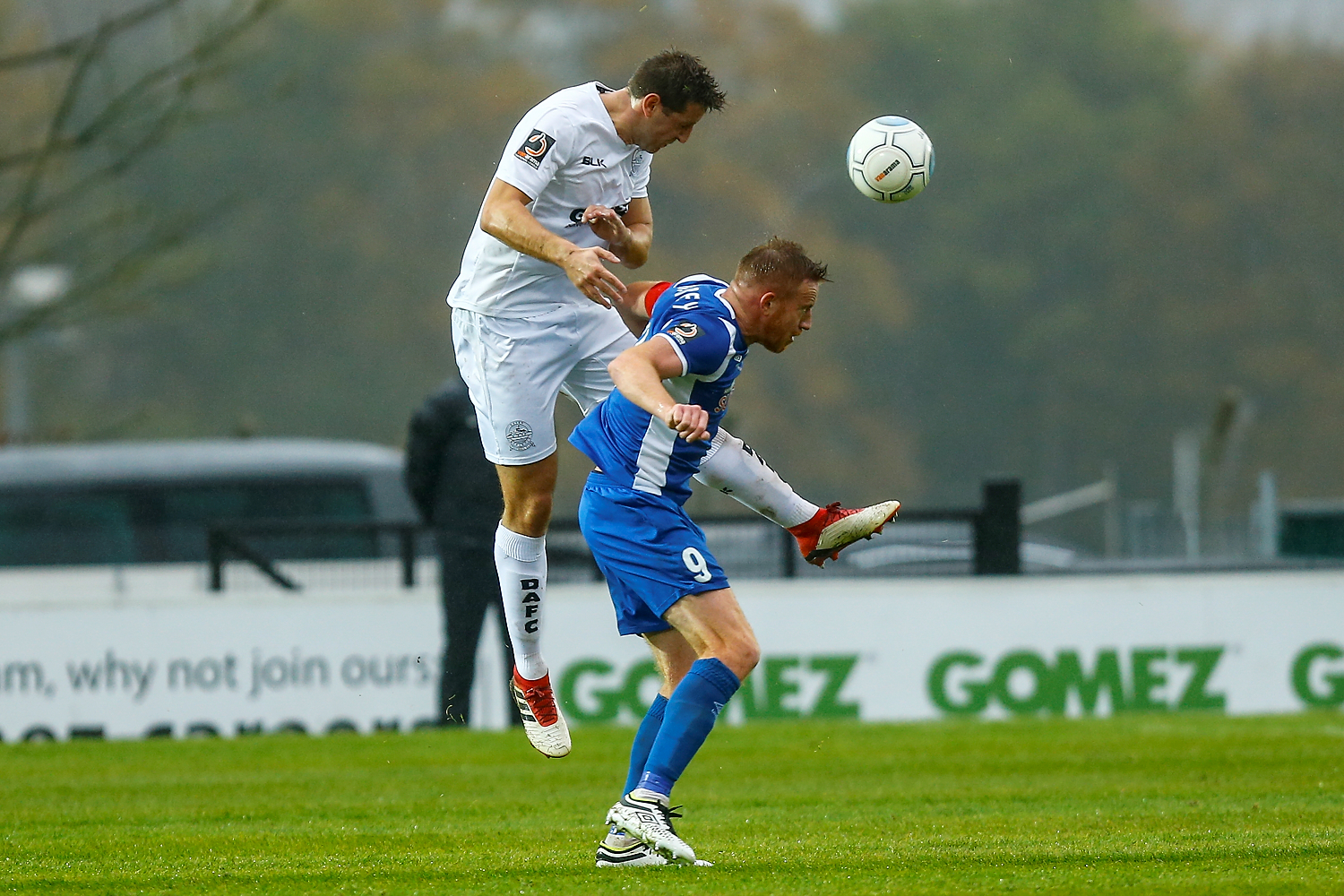 - Dovers defender Connor Essam wins the ball over Salford’s forward Adam Rooney.