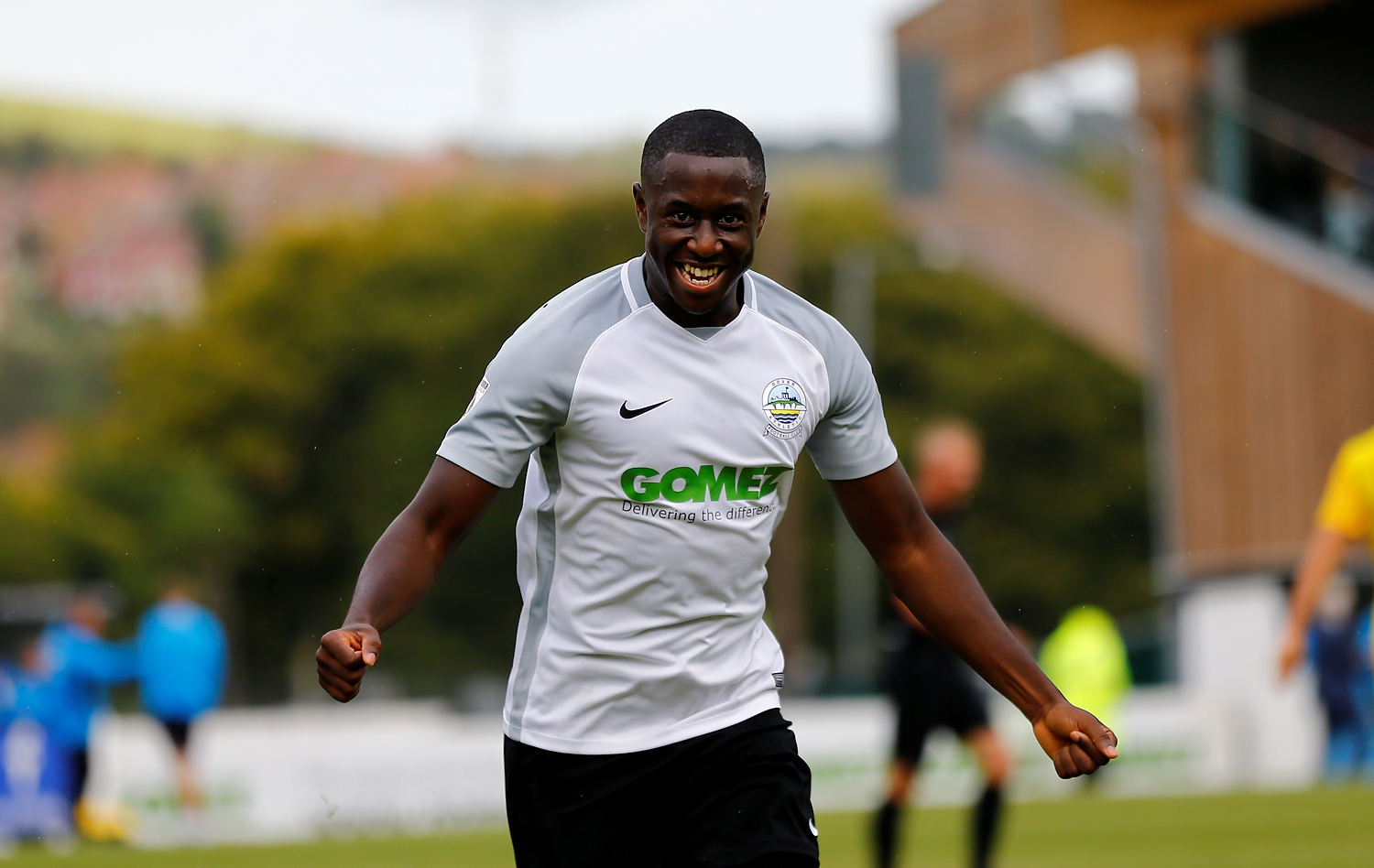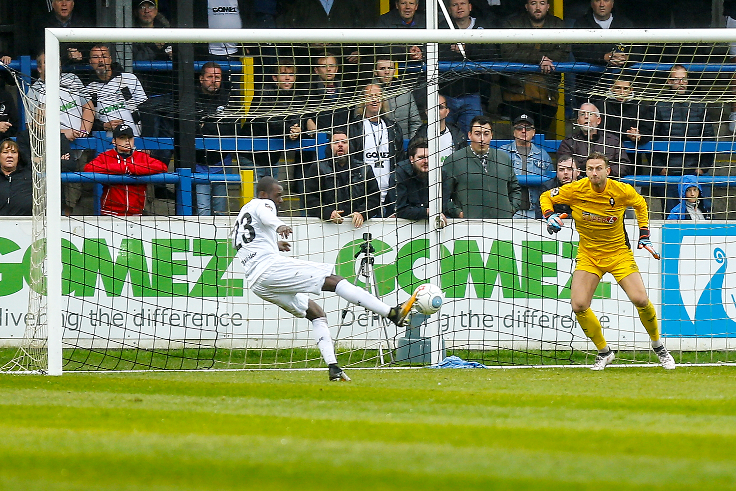 - Dovers midfielder Bedsenté Gomis fires home Dovers only goal during the National League match between Dover Athletic FC and Salford City FC