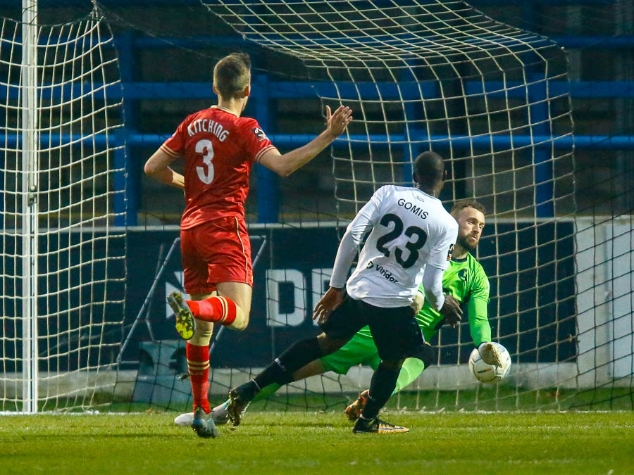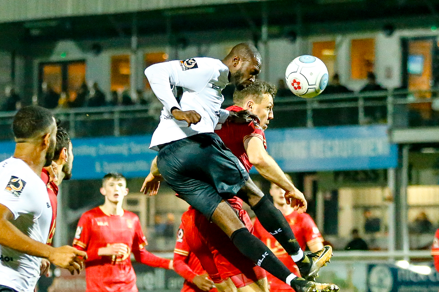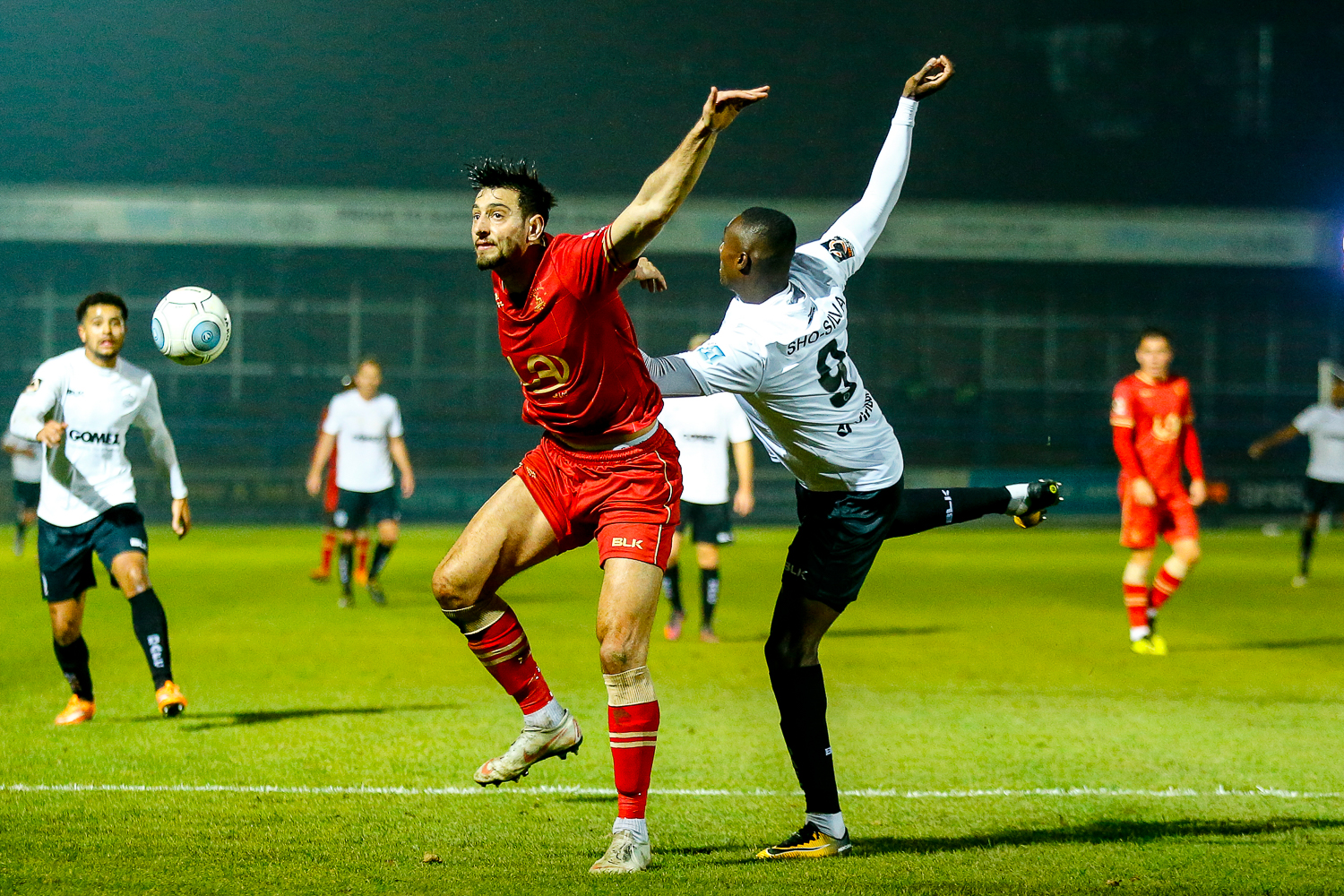 Third from top Dover Athletic against second from bottom Solihull Moors in Conference Premier at Crabble Stadium in Dover, England. Dover ran out winners by a goal to nothing. Dover’s defender Manny Parry puts Solihulls goal keeper Nathan Vaughan under pressure.