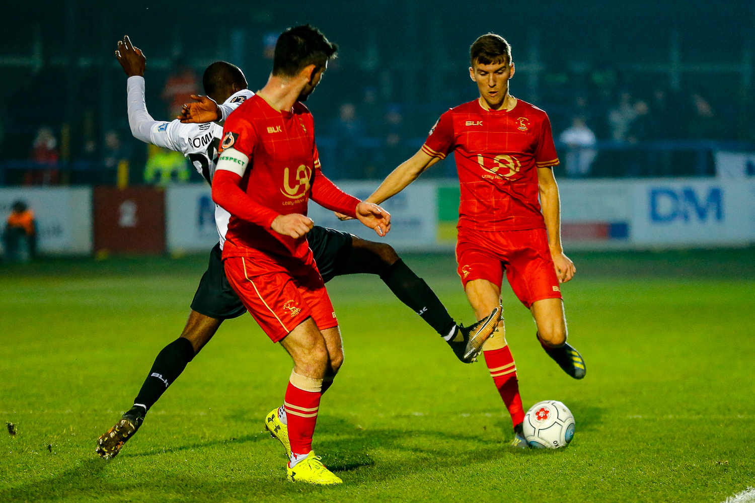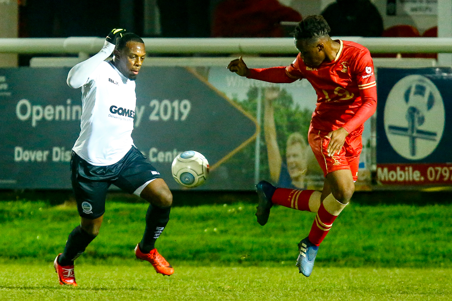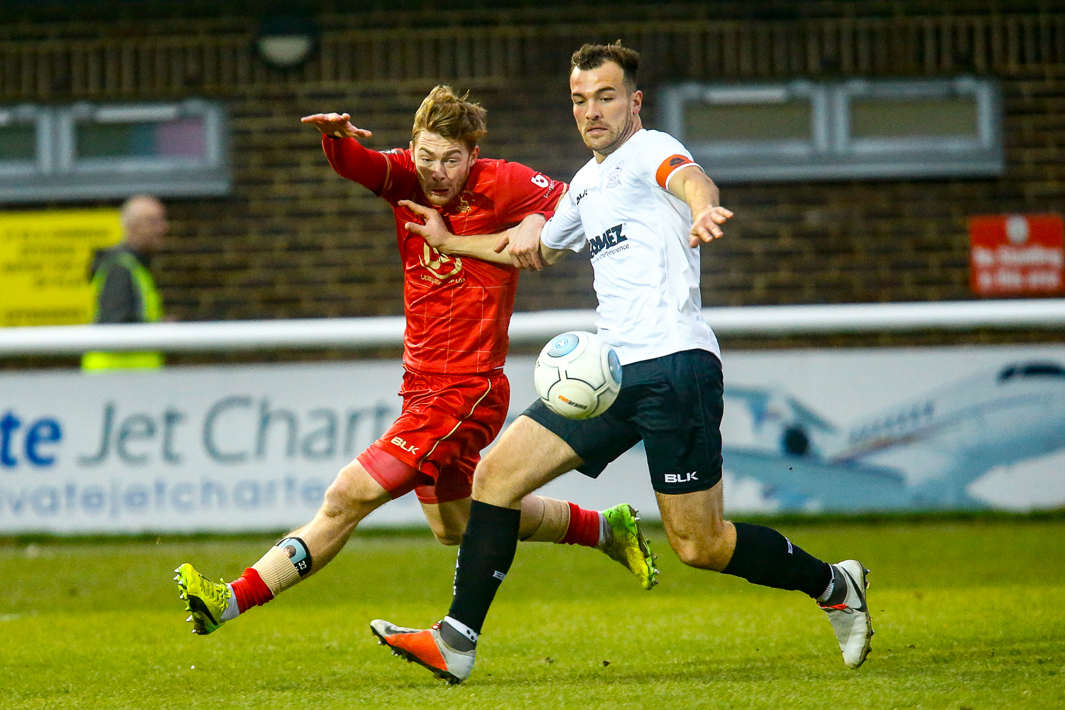 Top of the table Dover Athletic FC host eighth place Boreham Wood FC in Conference Premier at Crabble Stadium in Dover, England. The visitors, Boreham Wood ran out winners a goal to nothing. Dover’s forward Jamie Allen battles to keep Boreham Wood’s Tom Champion away from the ball.