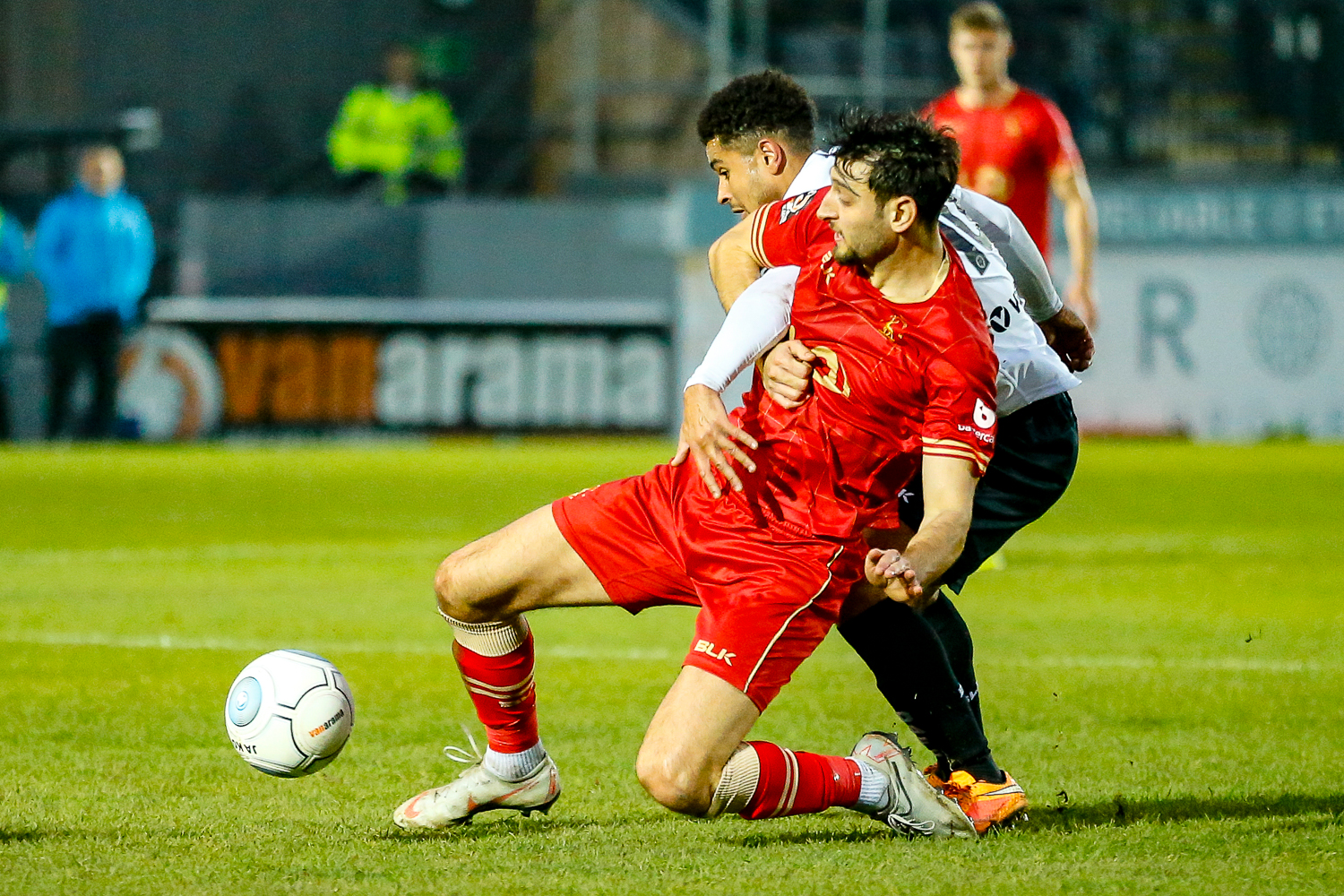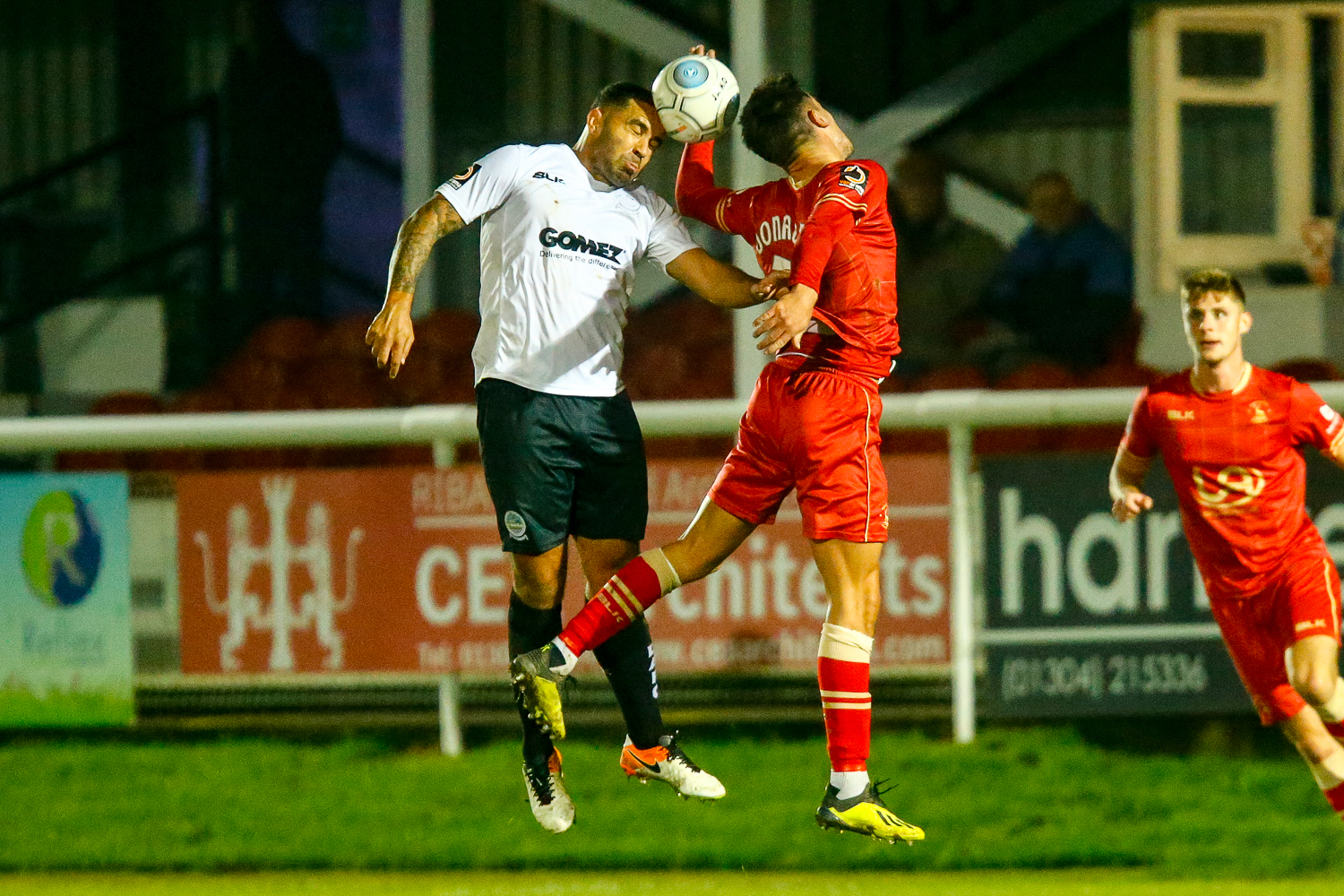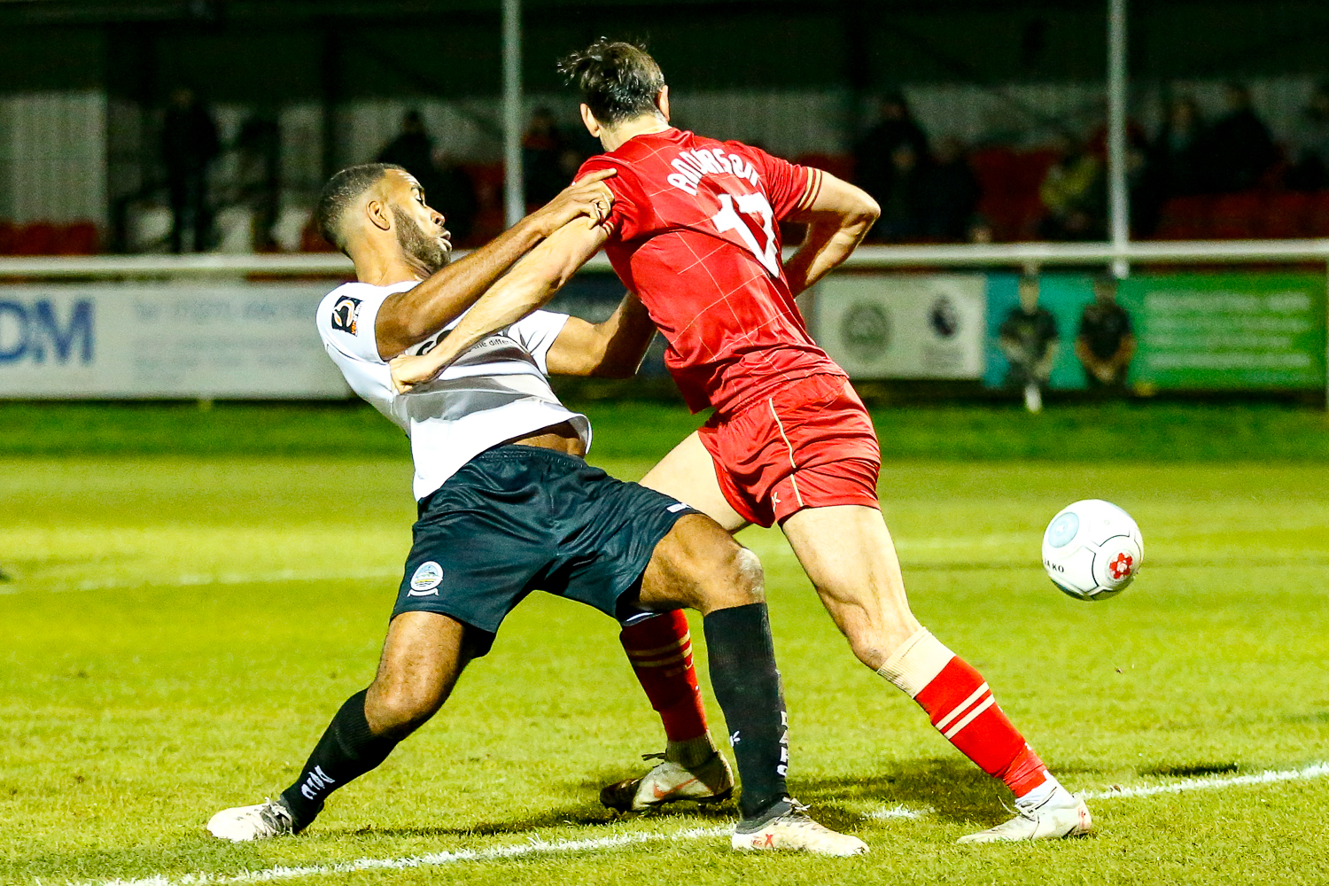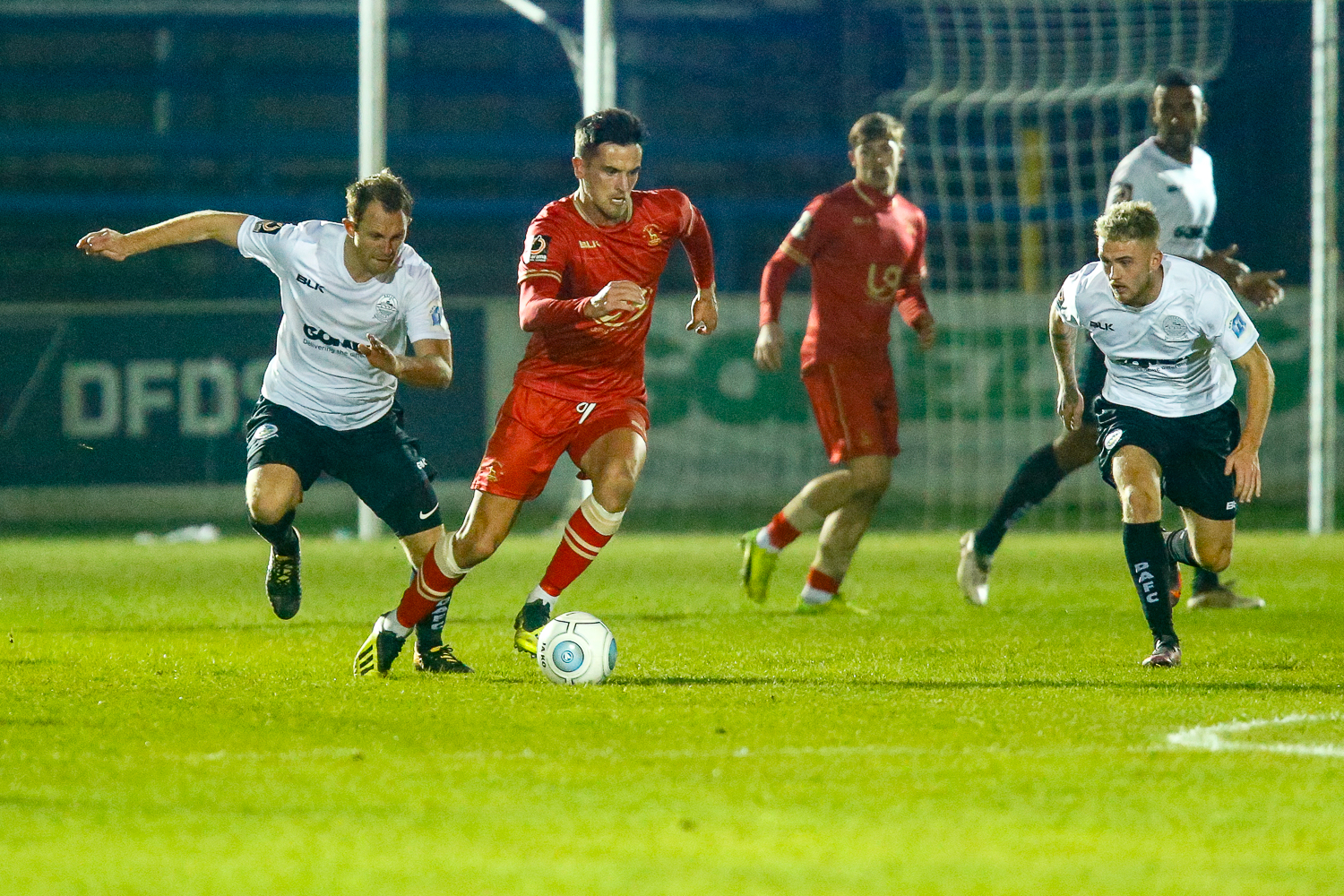 Top of the table Dover Athletic FC host eighth place Boreham Wood FC in Conference Premier at Crabble Stadium in Dover, England. The visitors, Boreham Wood ran out winners a goal to nothing. Dover’s forward Jamie Allen battles to keep Boreham Wood’s Tom Champion away from the ball.