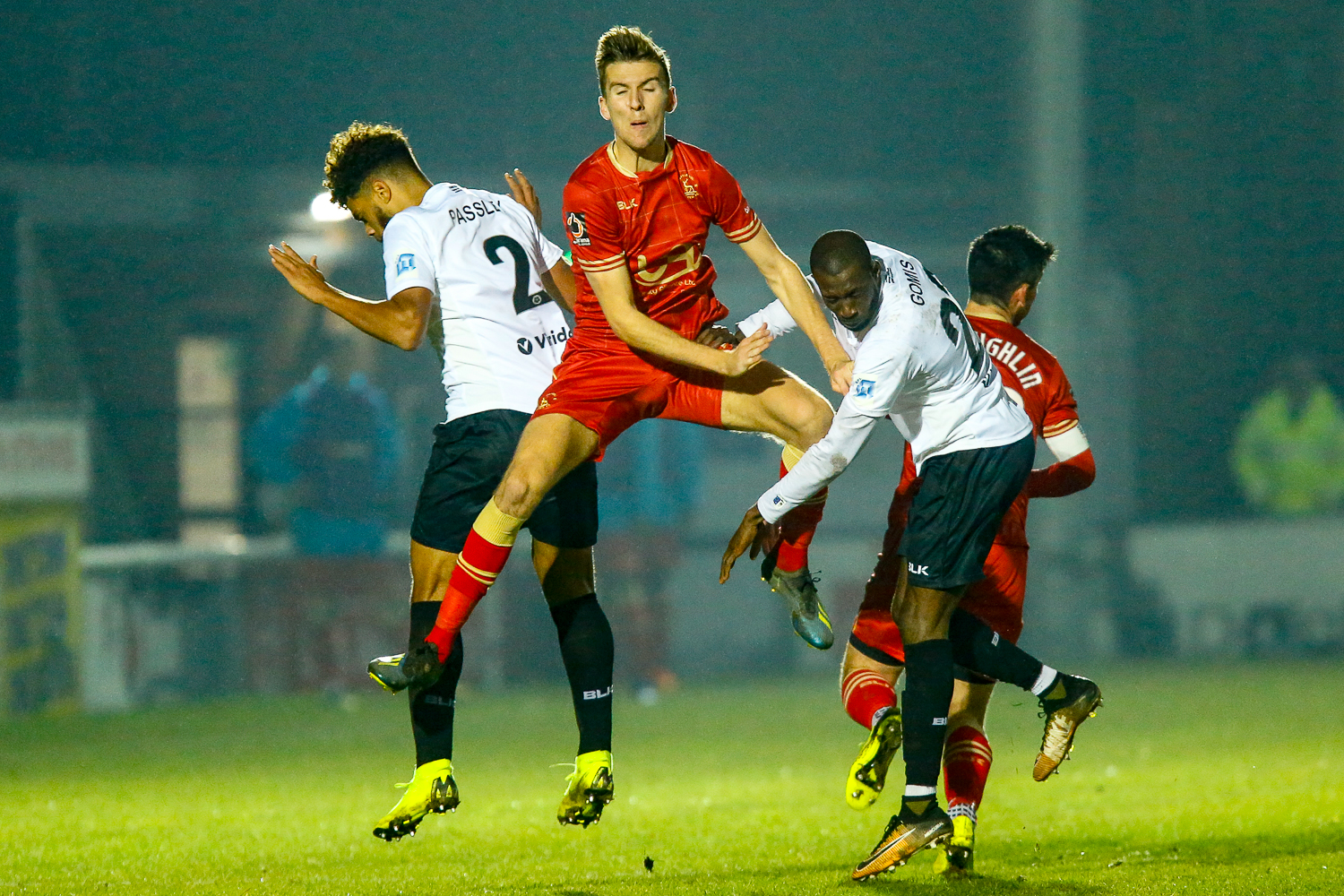 Dover Athletics defender Connor Essam celebrates scoring Dover’s second goal in the second half.