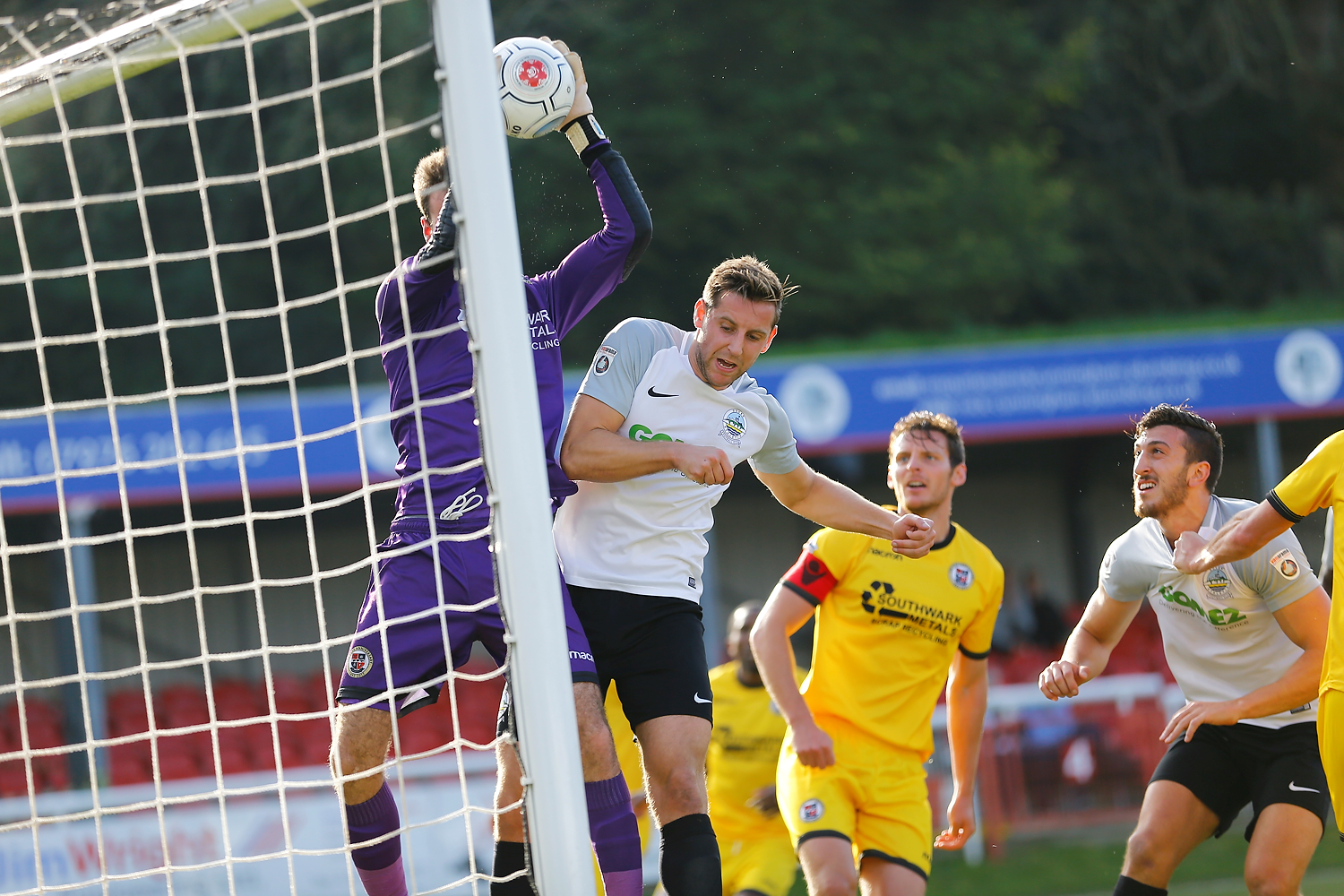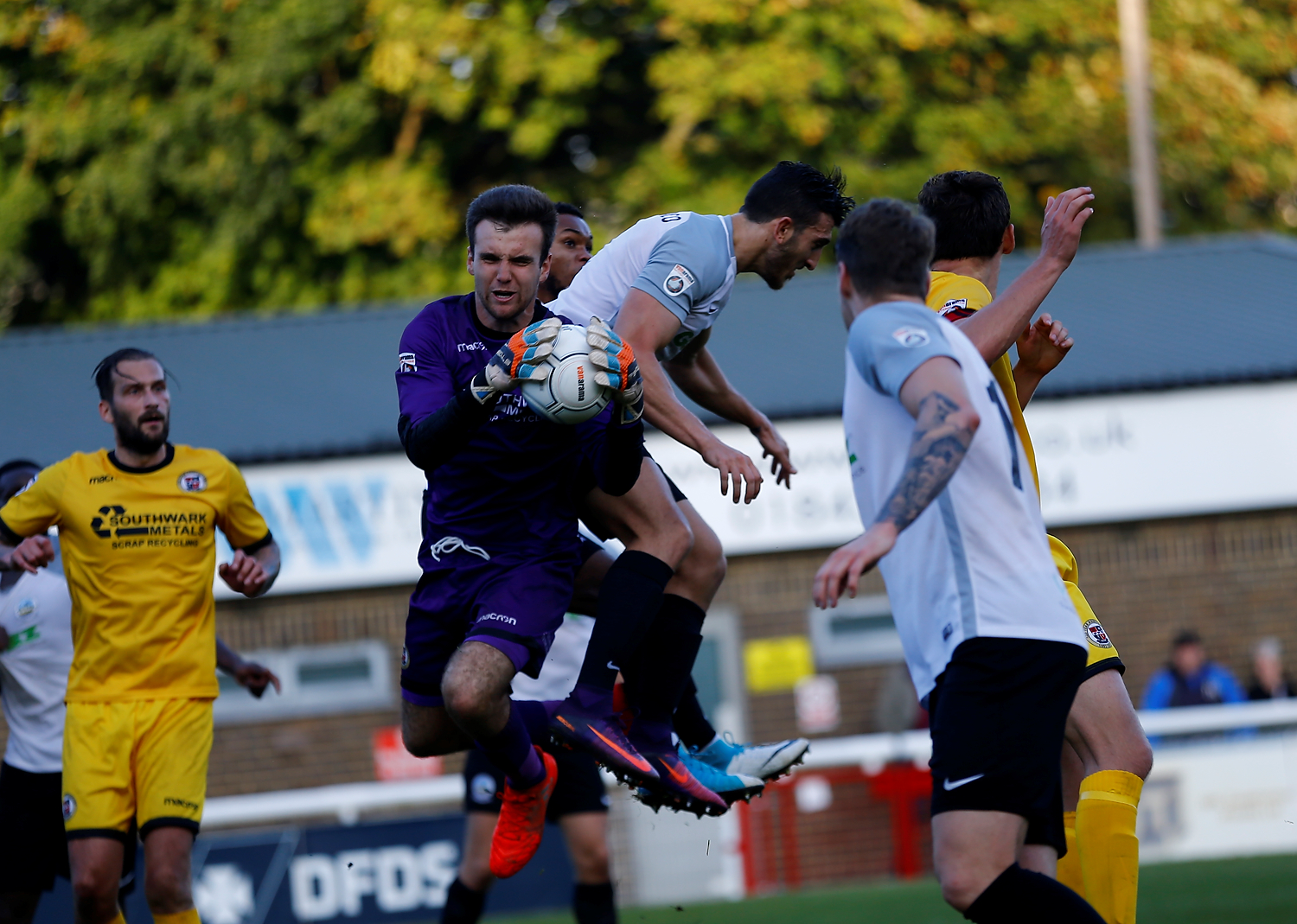 - OCTOBER 14: Dover’s defender Connor Essam is denied by Bromely’s goalkeeper David Gregory