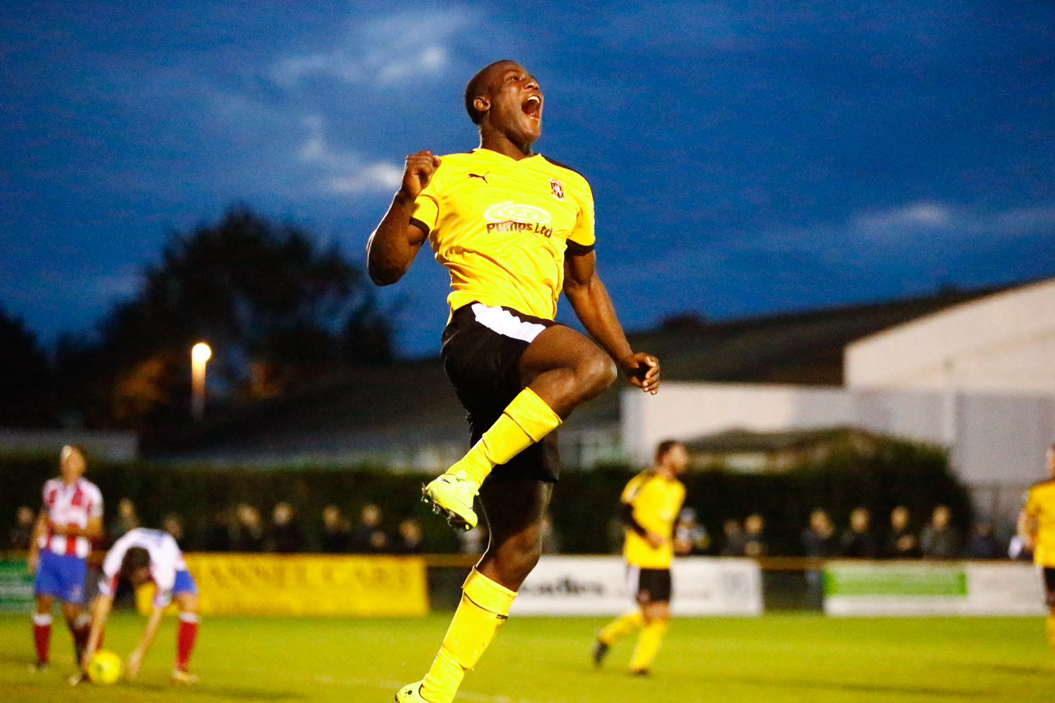 NOVEMBER 4, 2017: Folkestone Invicta against Dorking Wanderers in Bostik League Premier Division. Where the home side ran out 3 to 1 winners. Fullicks Stadium, England.Folkestones Ade Yusuff celebrates after putting the home side 3 to 1 up from his penalty in the 90th minute.