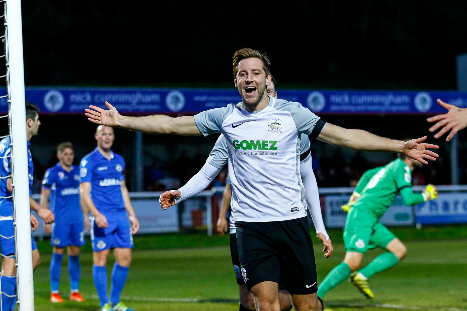 - Dover Athletics defender Connor Essam celebrates scoring Dover’s second goal in the second half.