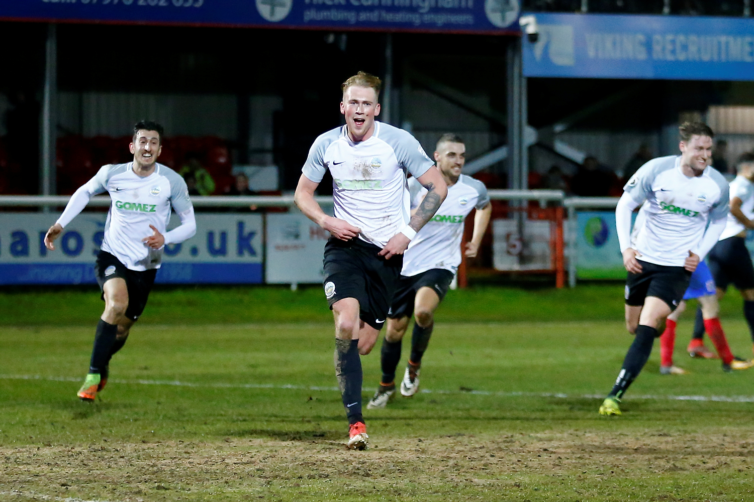 - Dovers Mitch Pinnock rushes to celebrate after scoring during the Vanorama National League match between Dover Athletic and Dagenham and redbridge FC