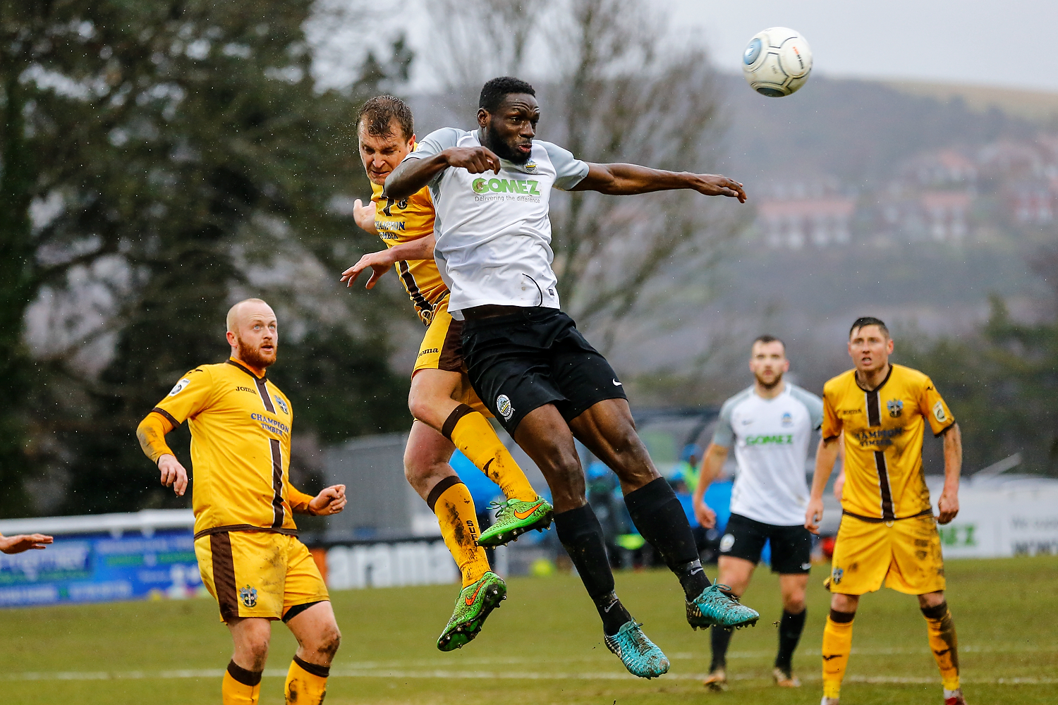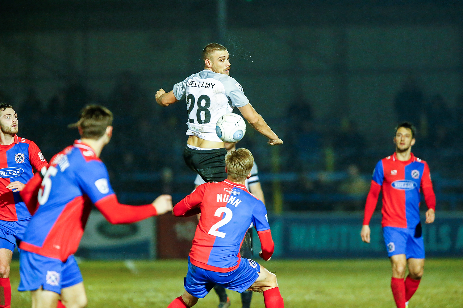 - Dover’s midefiedler Liam Bellamy heads the ball on during the Vanorama National League match between Dover Athletic and Dagenham and redbridge FC