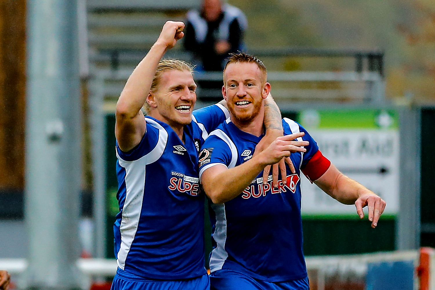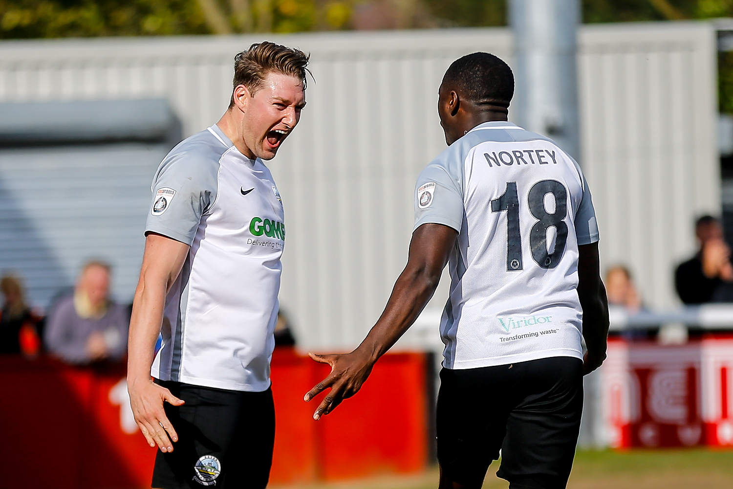 Salford’s defender Carl Piergianni celebrates with Salford’s forward Adam Rooney after scoring his hat-trick during the National League match between Dover Athletic FC and Salford City FC.