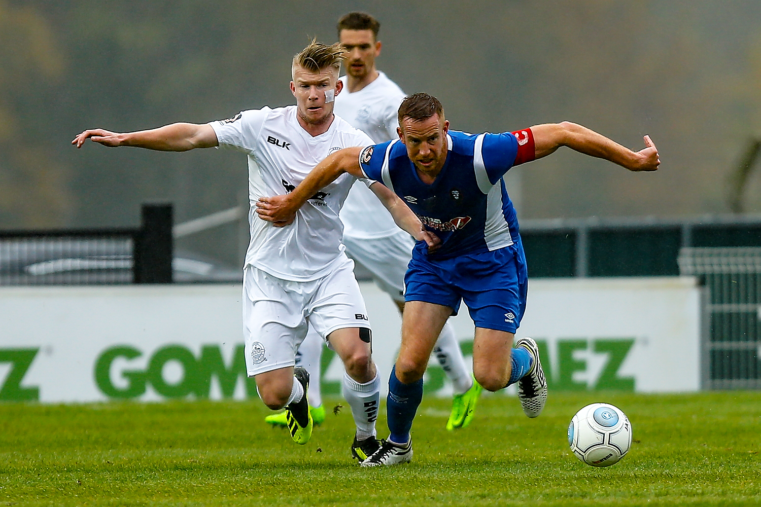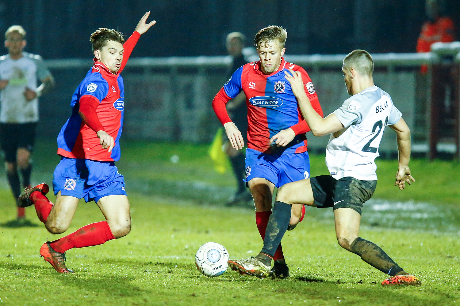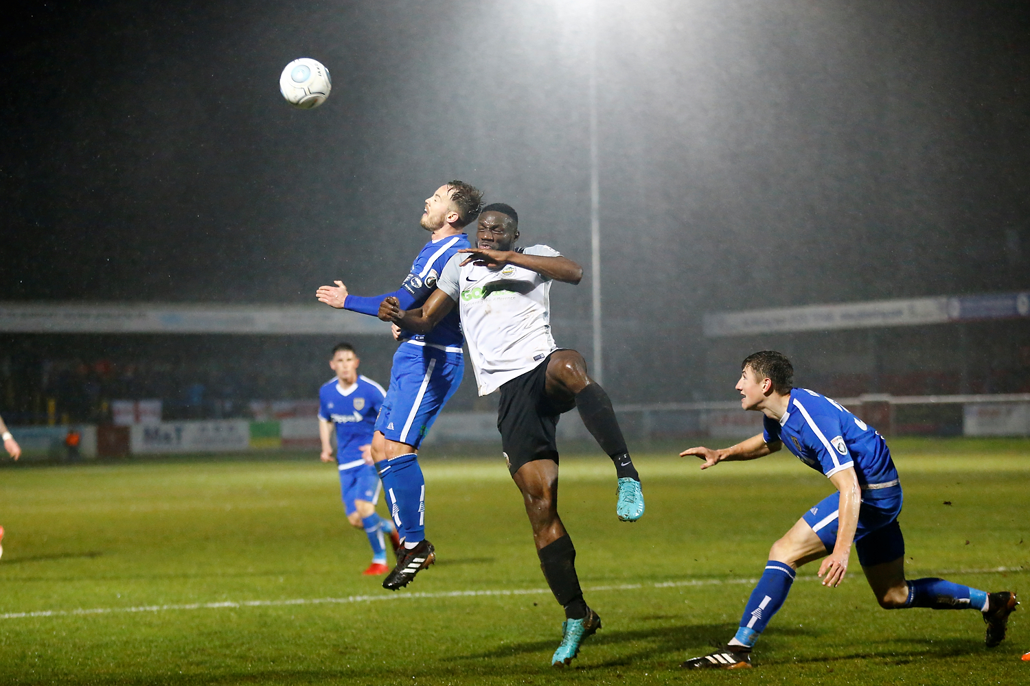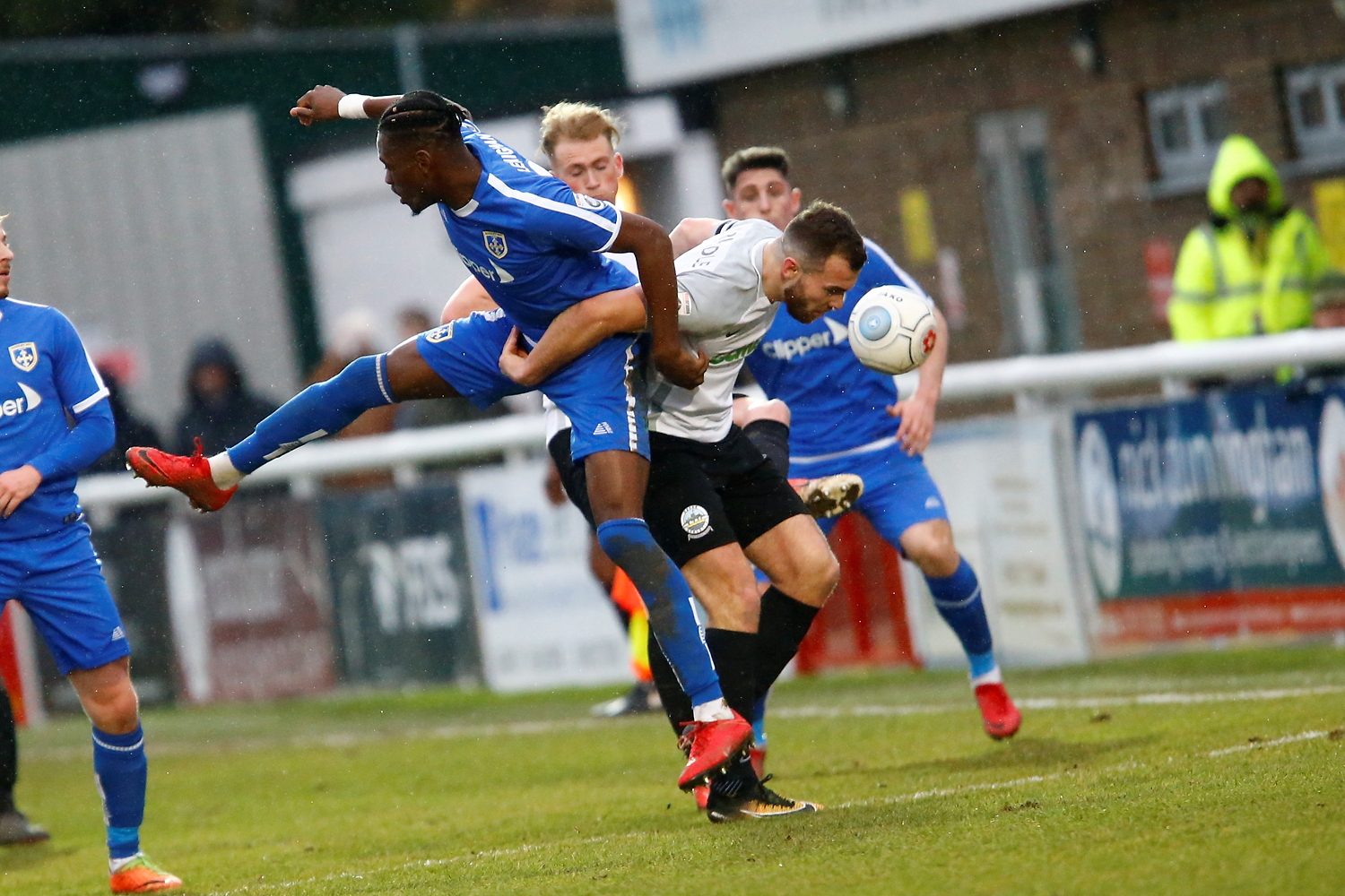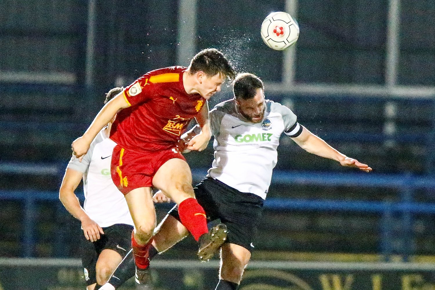 - Dovers defender Connor Essam wins the ball over Salford’s forward Adam Rooney.