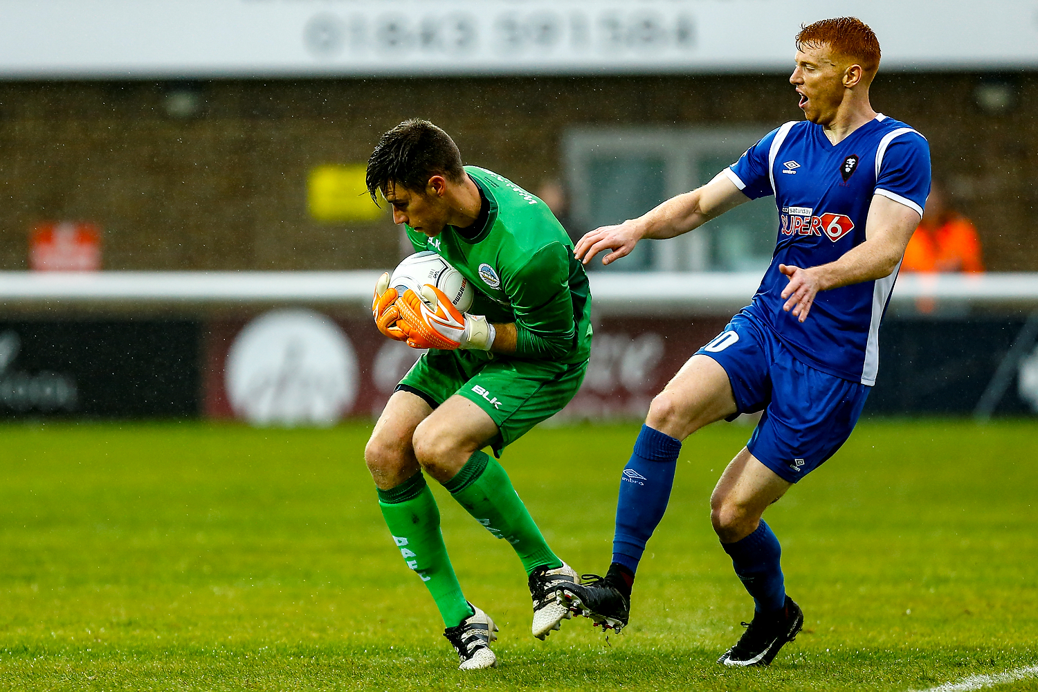 - Dovers keeper Mitch Walker collects the ball ahead of Salford’s forward Rory Gaffney.