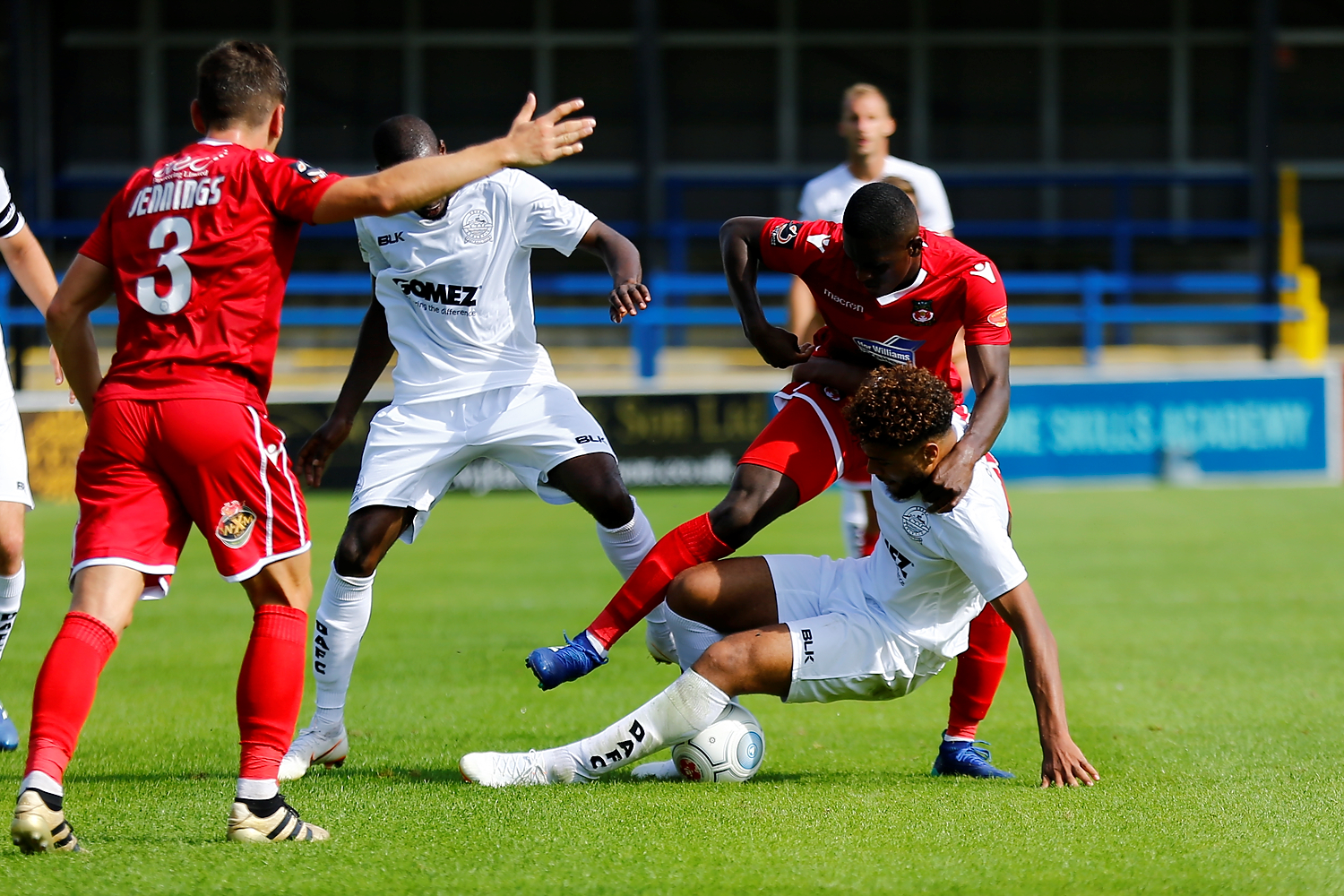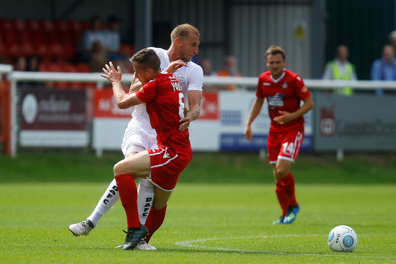 - Dovers forward Jamie Allen is held back by Wrexhams midfielder Luke Young.